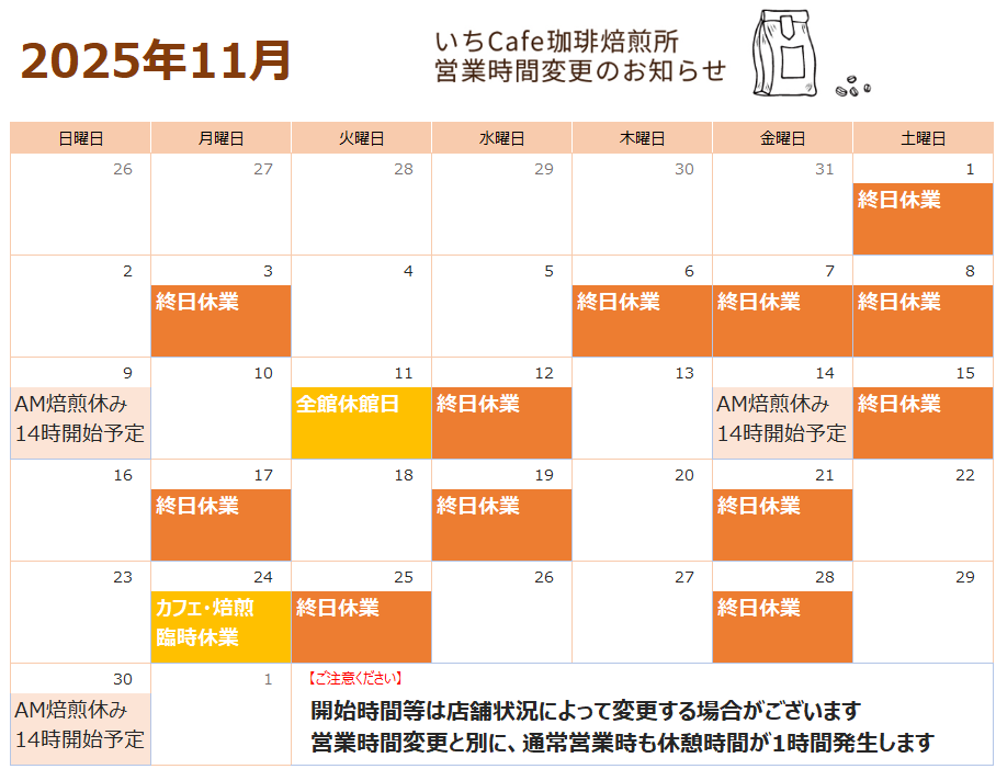 いちCafe珈琲焙煎の営業を一部変更とさせていただきます。