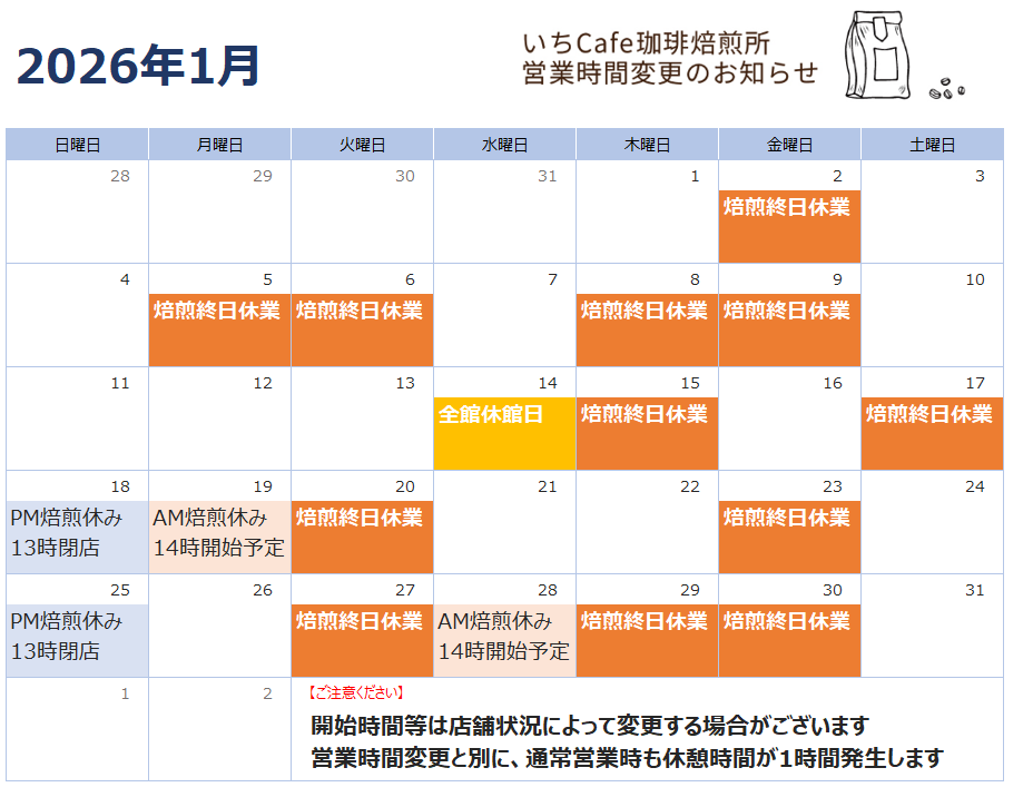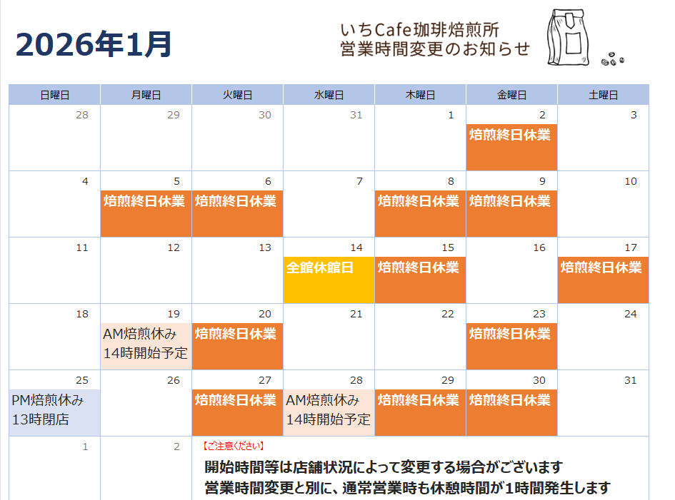 いちCafe珈琲焙煎の営業を一部変更とさせていただきます。